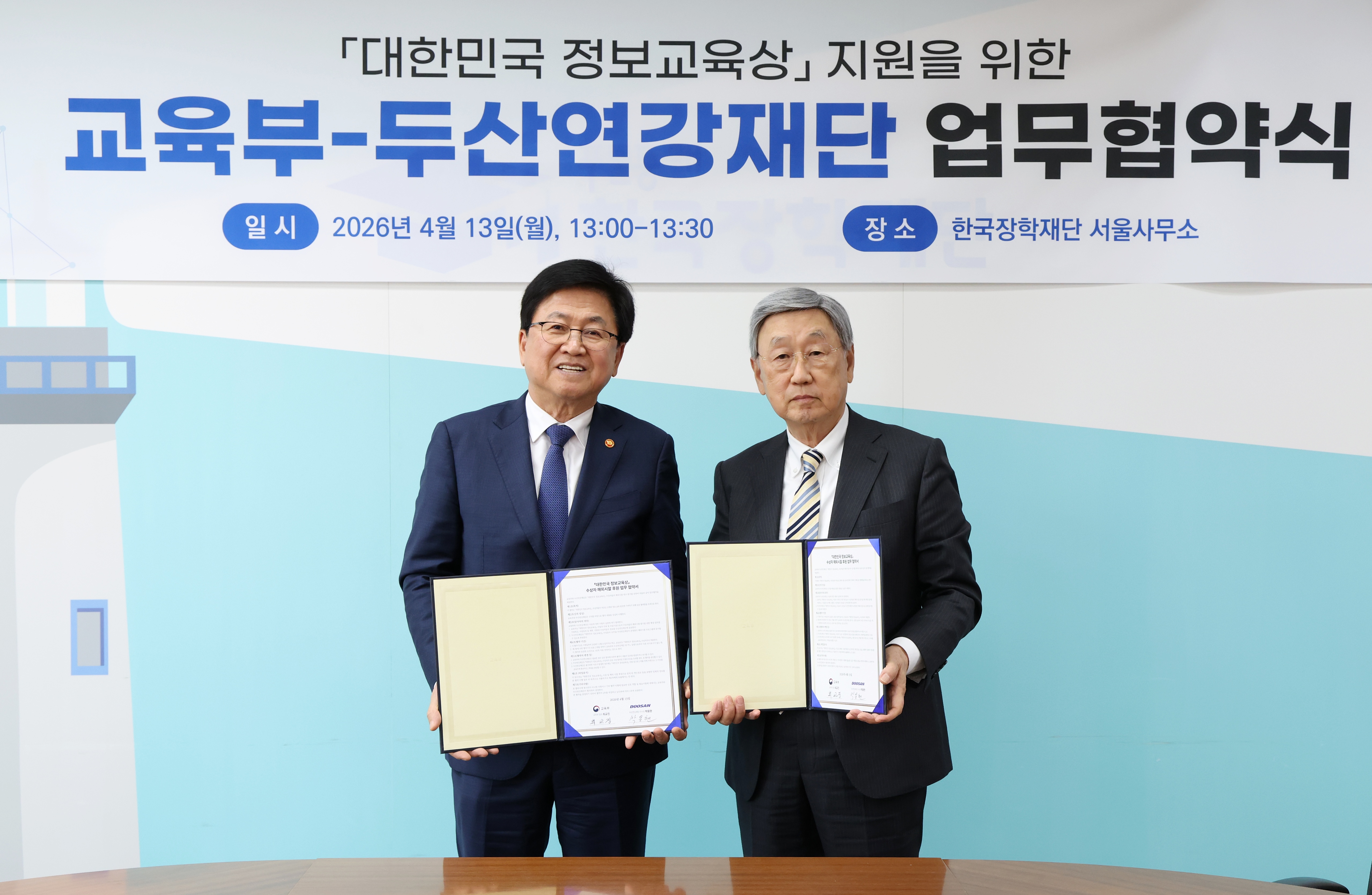 두산연강재단은 교육부가 선정하는 '대한민국 정보교육상' 수상자들에게 해외시찰을 지원하는 업무협약을 맺었다고 13일 밝혔다.